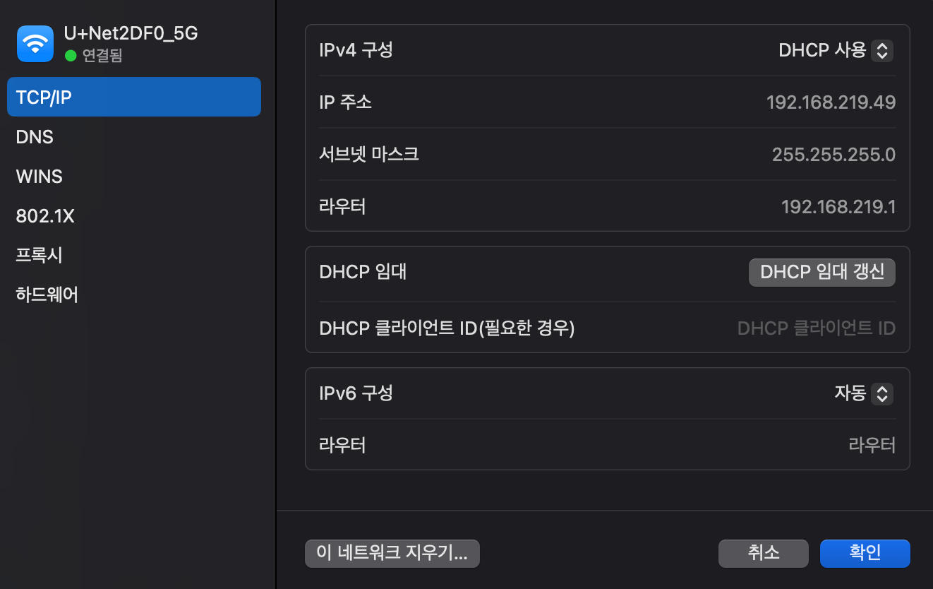 실제 macOS 기준, 아래와 같이 공인 IP(공유기, 와 내부 IP가 모두 존재함을 확인할 수 있다.